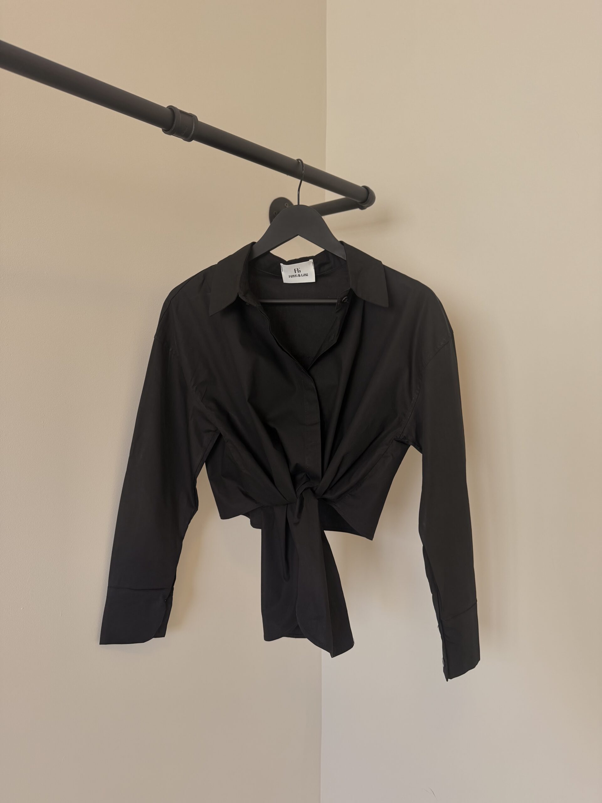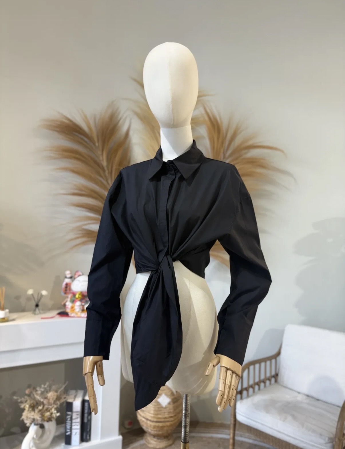 CAMISA de manga larga y tejido ligero, con un acabado fluido. El diseño destaca por un nudo frontal a la altura de la cintura, creando un efecto drapeado que estiliza la silueta y deja ver ligeramente el abdomen aportando un aire moderno y femenino.