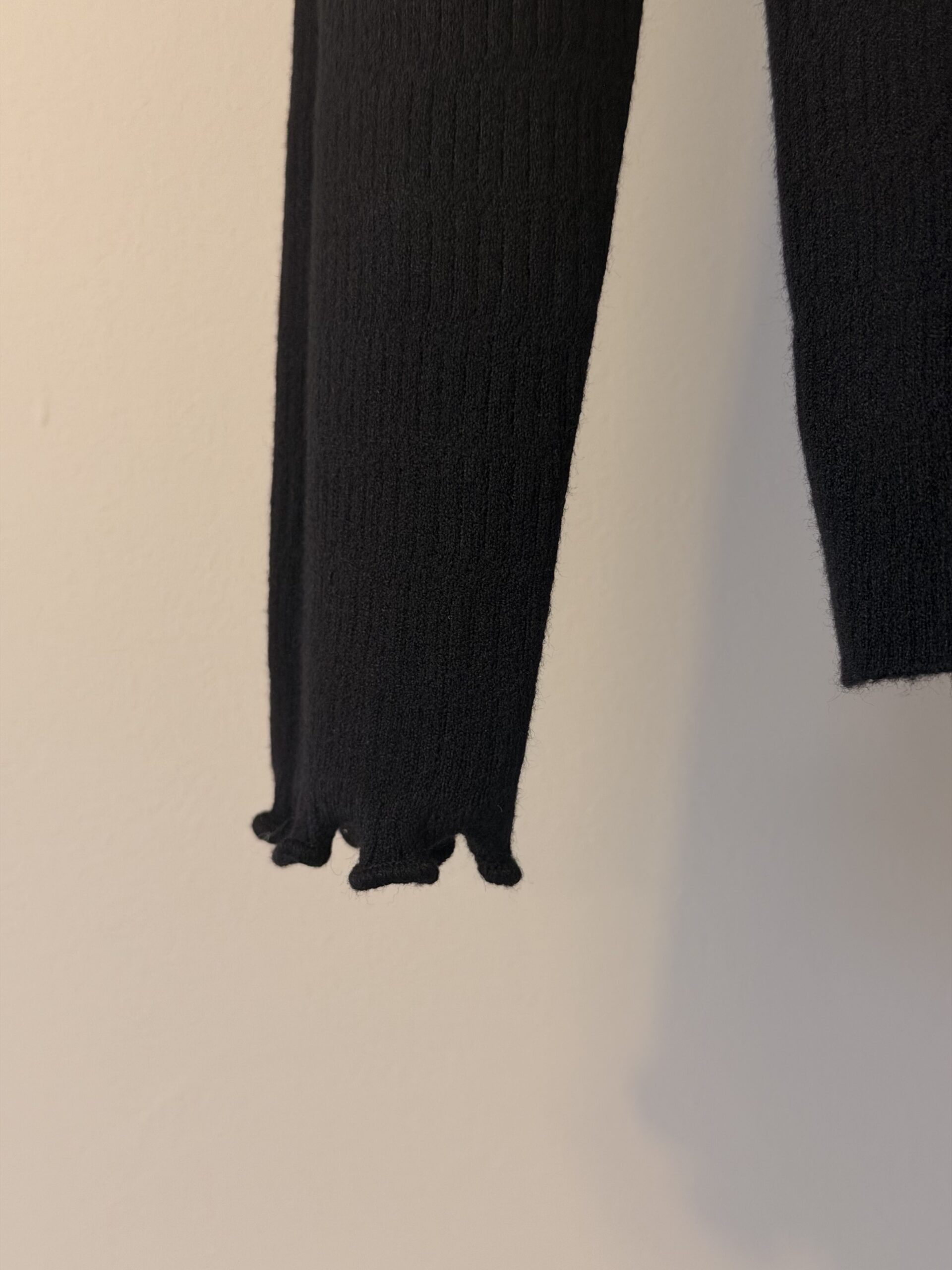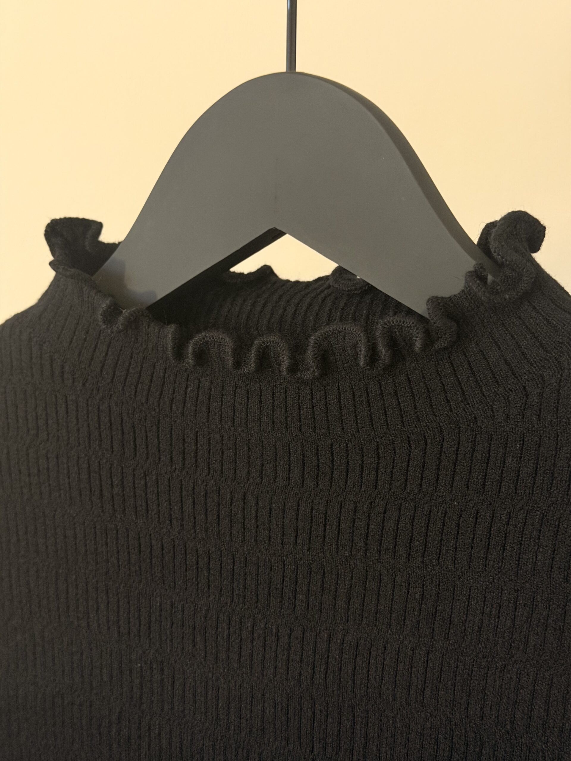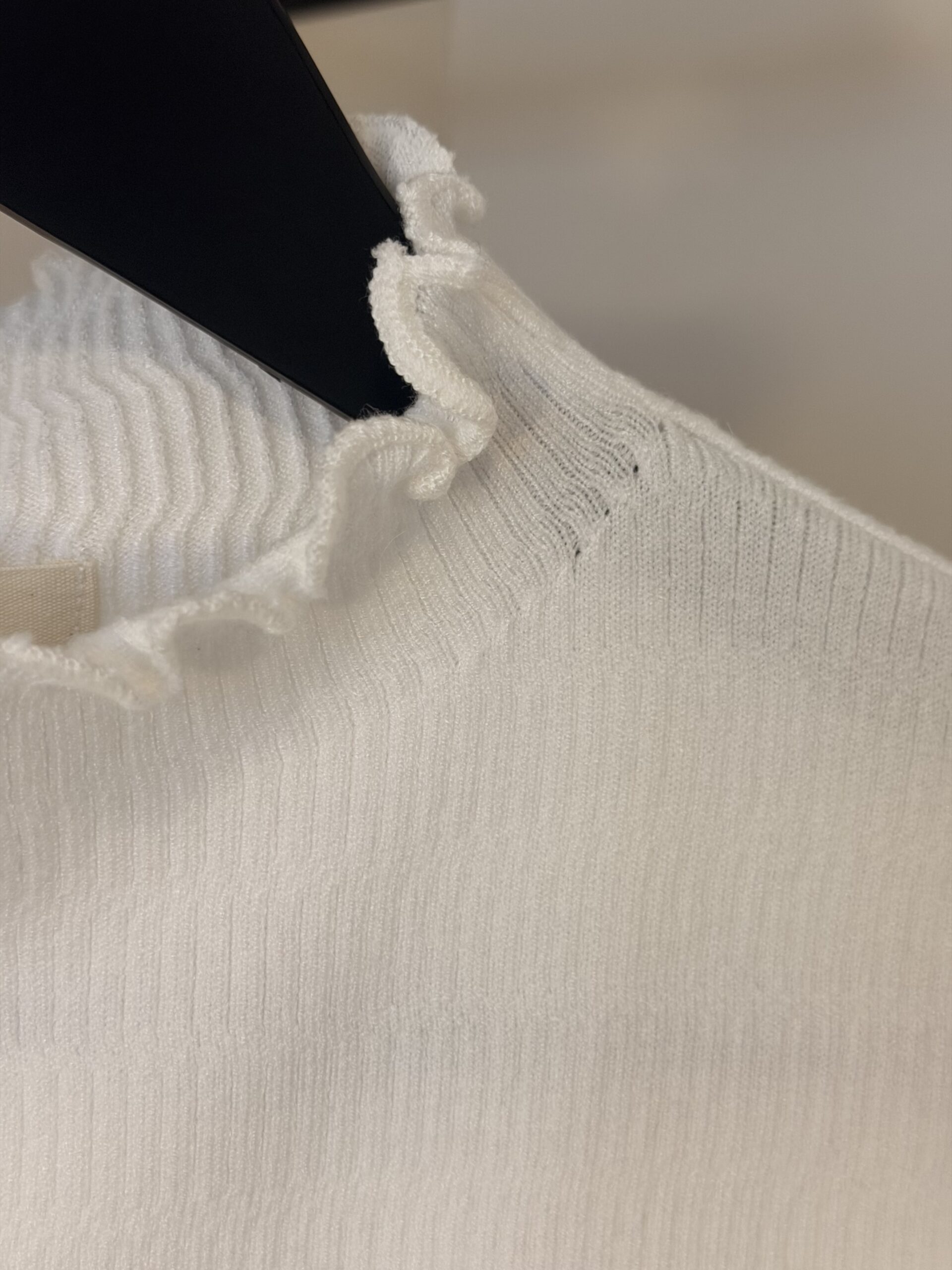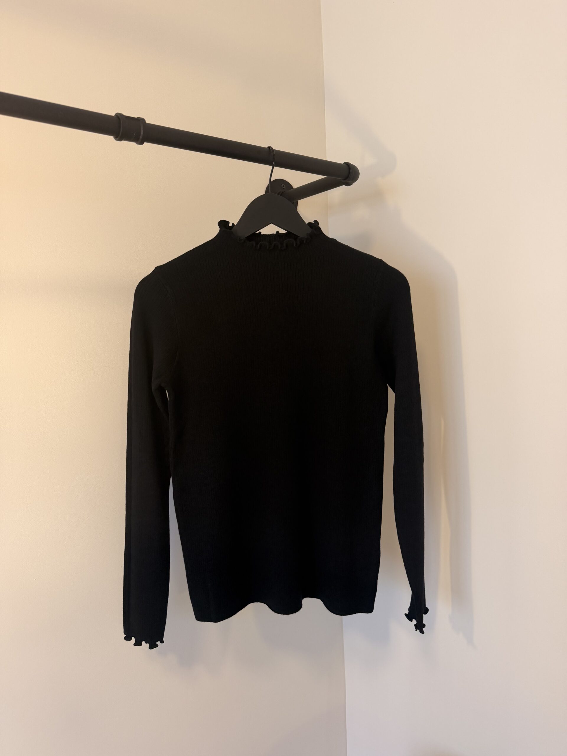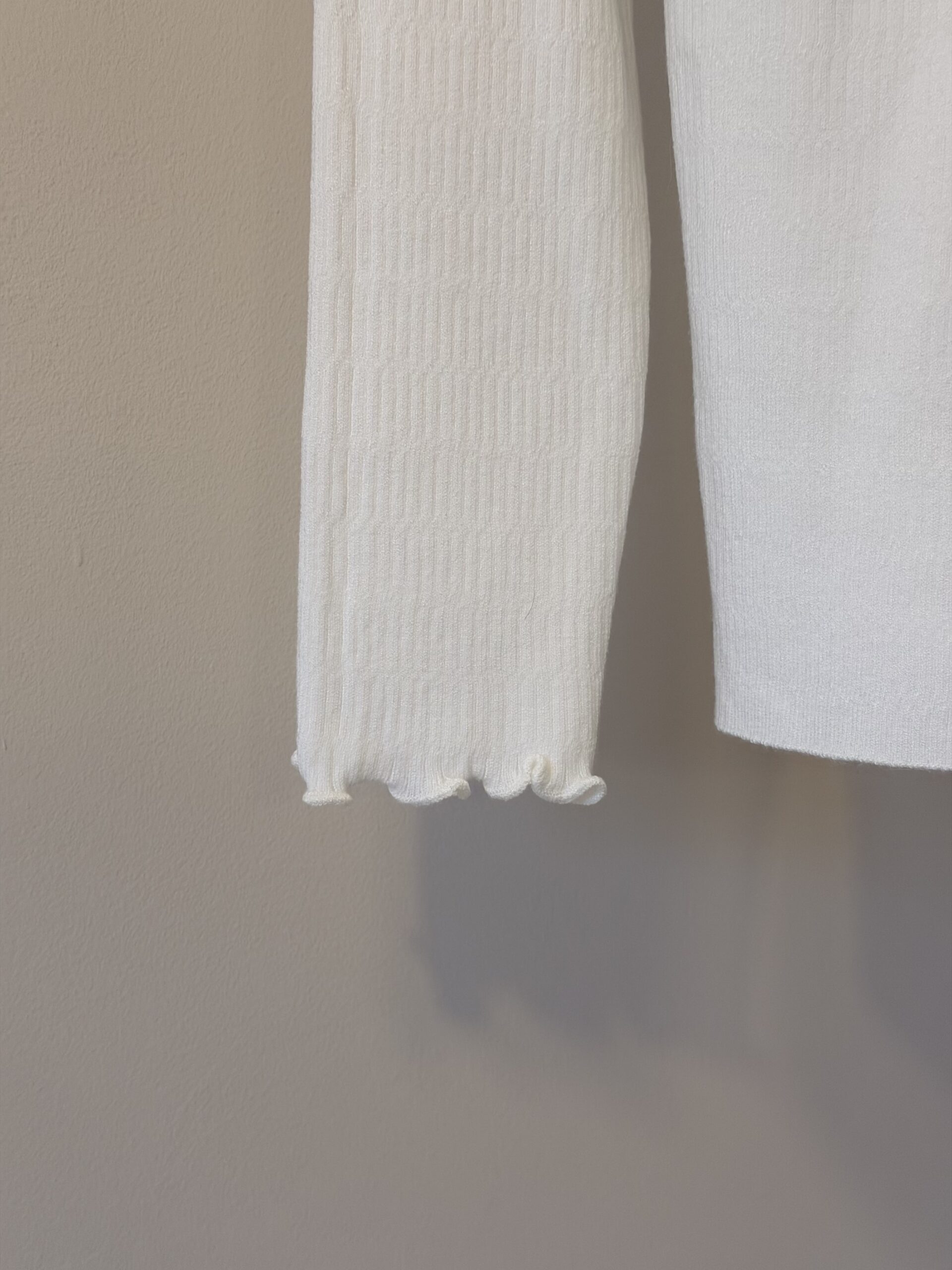 Jersey de manga larga confeccionada en tejido acanalado de alta suavidad y elasticidad, que ofrece un ajuste cómodo y favorecedor. Presenta cuello alto con delicado acabado ondulado, un detalle sutil que aporta un toque femenino y elegante, presente también en puños y bajo.