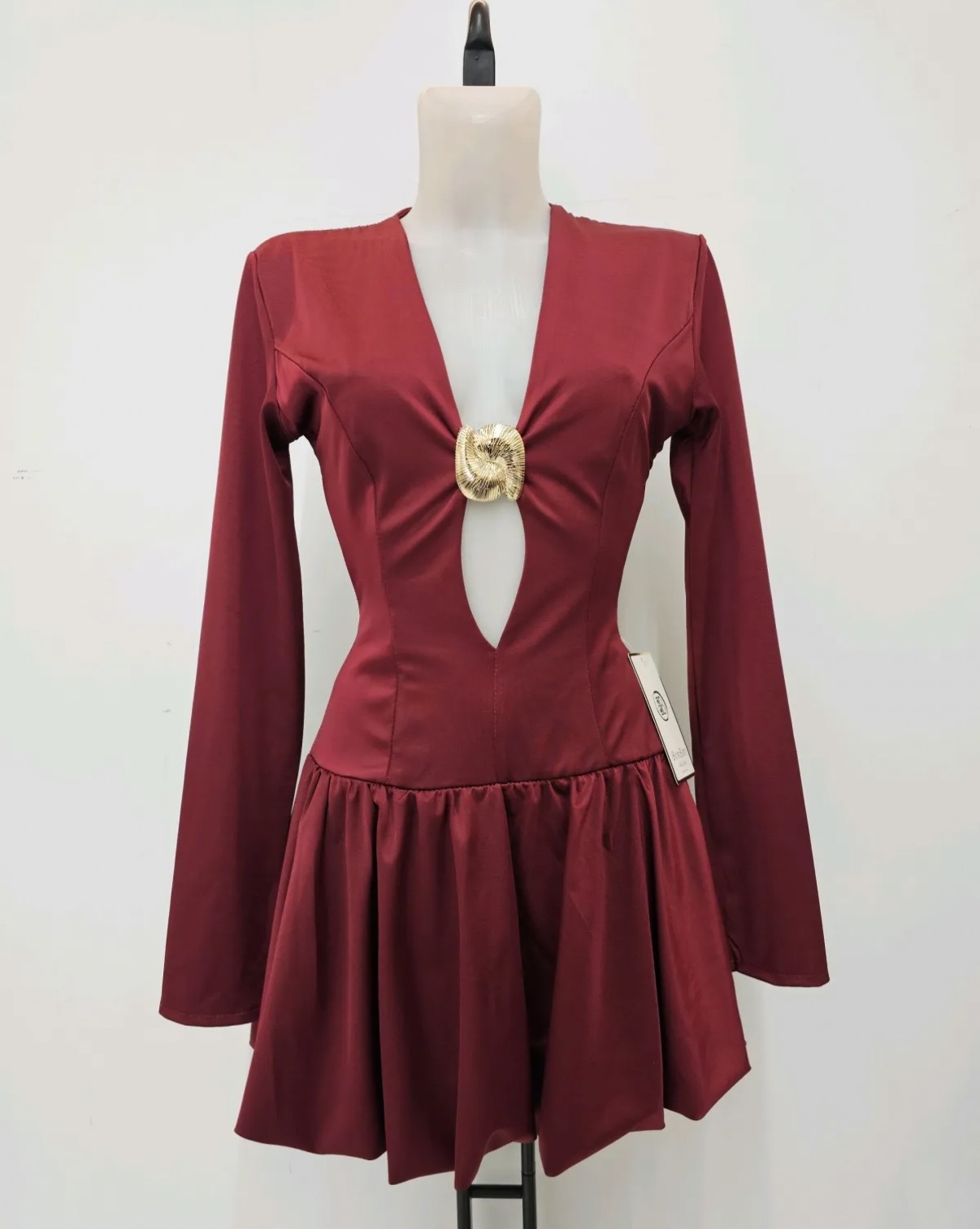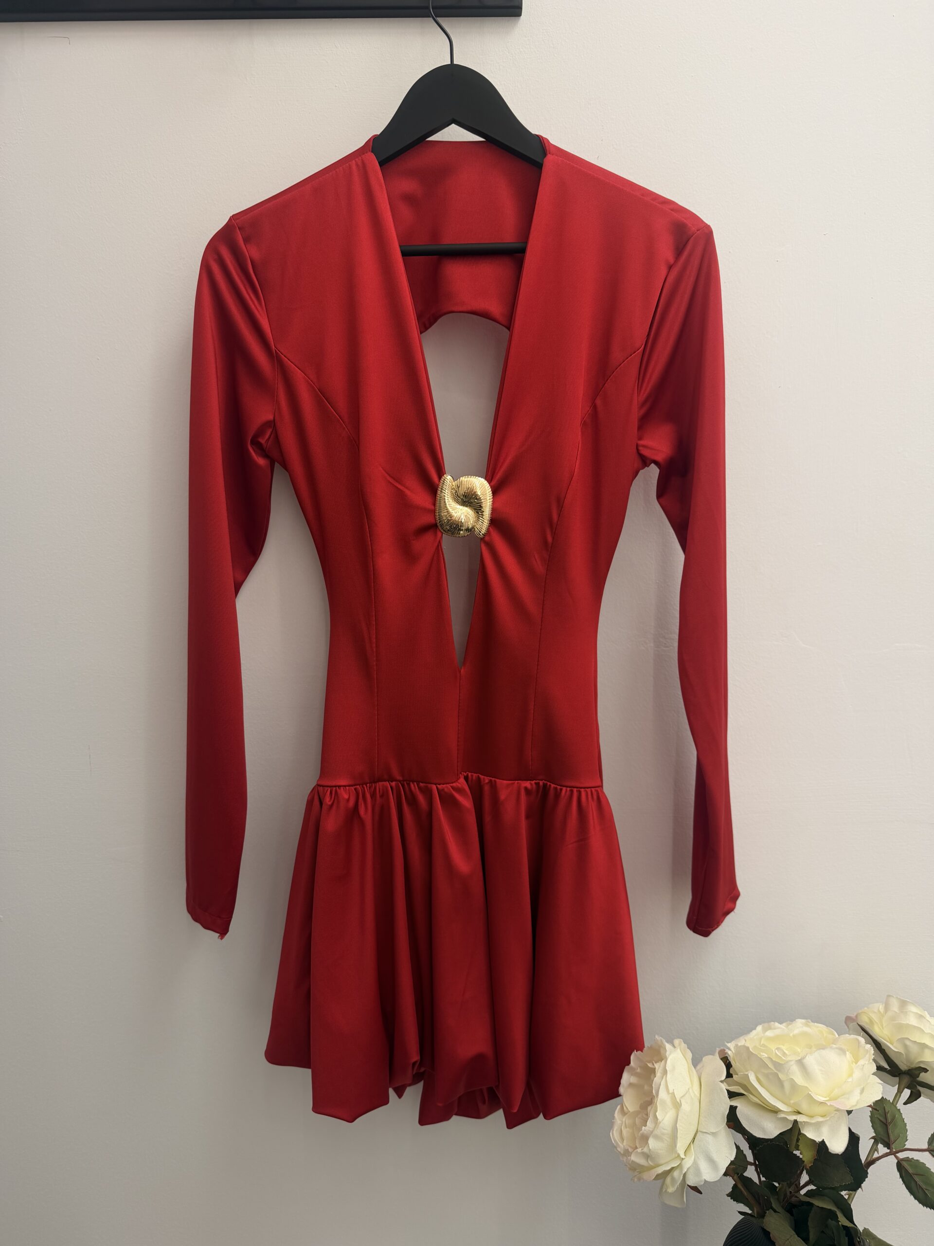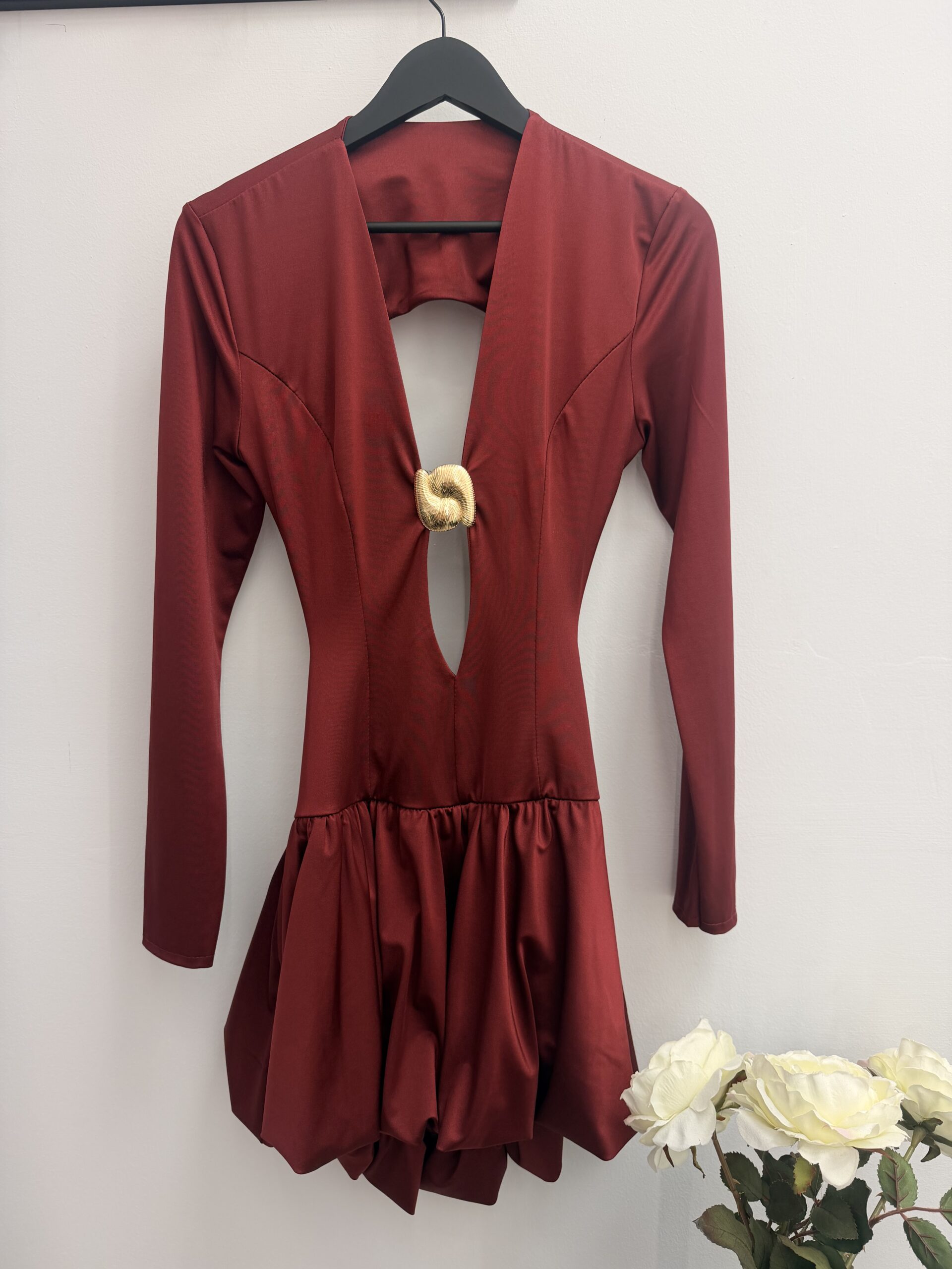 vestido corto de color rojo/burdeos con un diseño elegante y llamativo.